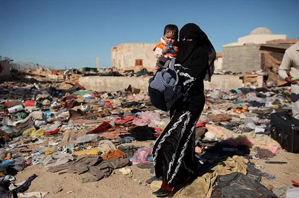 Seorang pengungsi berusaha untuk membawa barang-barangnya ke sebuah kapal angkatan laut Mesir yang merapat di pelabuhan Zarzis